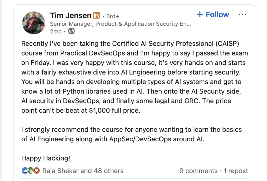 | Certified AI Security Professional (CAISP) | Practical DevSecOps | DevSecOps Engineers, Red Teamers, AppSec, Software Developers, AI SOC Orchestrator, AI Offensive Orchestrator, AI/ML Security Engineer, DevOps Engineers,and an AI Security Specialist. | ~$999 | Counter LLM threats, OWASP Top 10 framework, mitigate AI supply chain risks and attacks, Apply AI threat modeling with STRIDE methods,and secure DevOps against AI-specific attacks. |